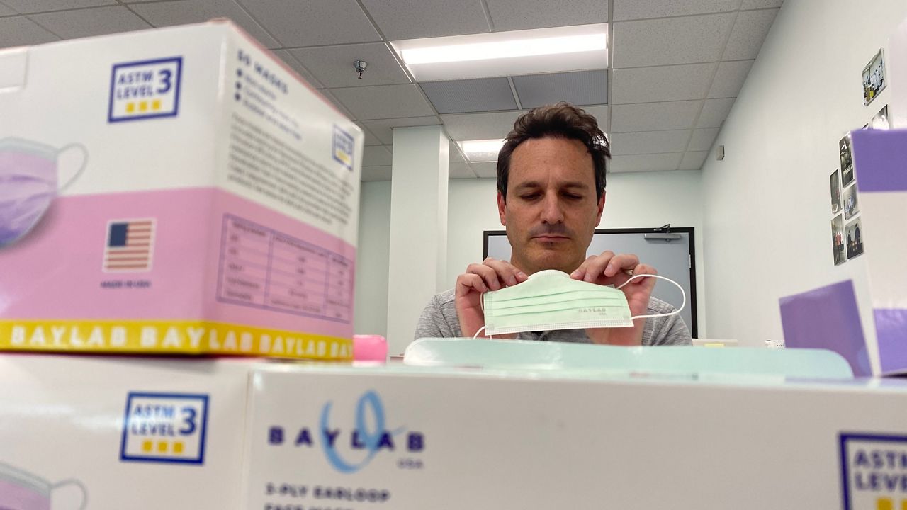 Greg Bartell, of Baylab USA examines some of the masks. (Spectrum News 1/Chris Grisby)